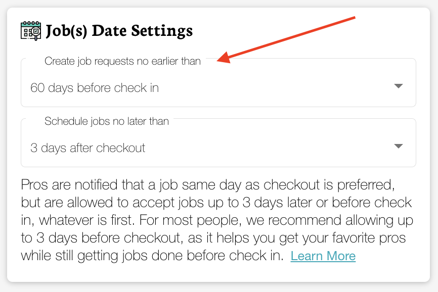 - If set to 3, pros can accept jobs after checkout and check in of the next guest (up to 3 days later).