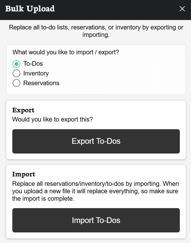 Keep in mind that when importing one of these options by uploading a file, reservations for example, the new file will replace all existing reservations. Be cautious when using this feature to avoid accidentally overwriting your data.