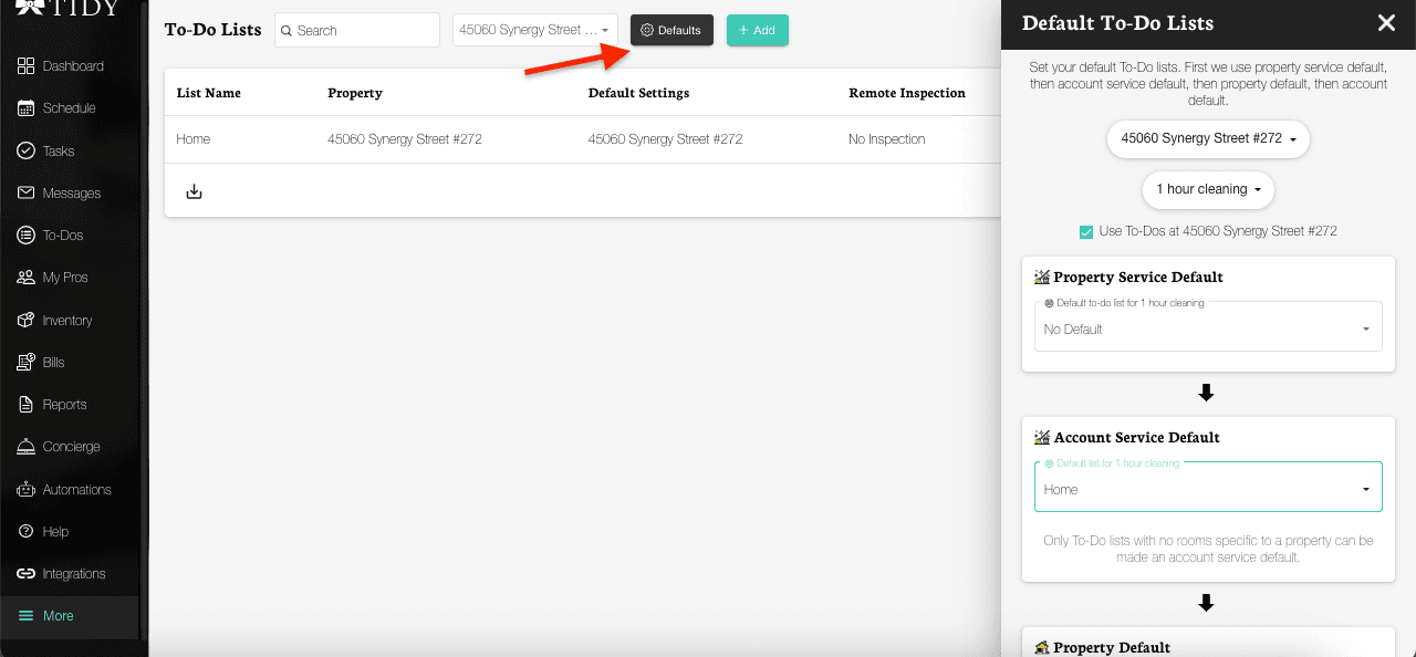 - To set your default lists, go to the To-Dos section and hit "Defaults"