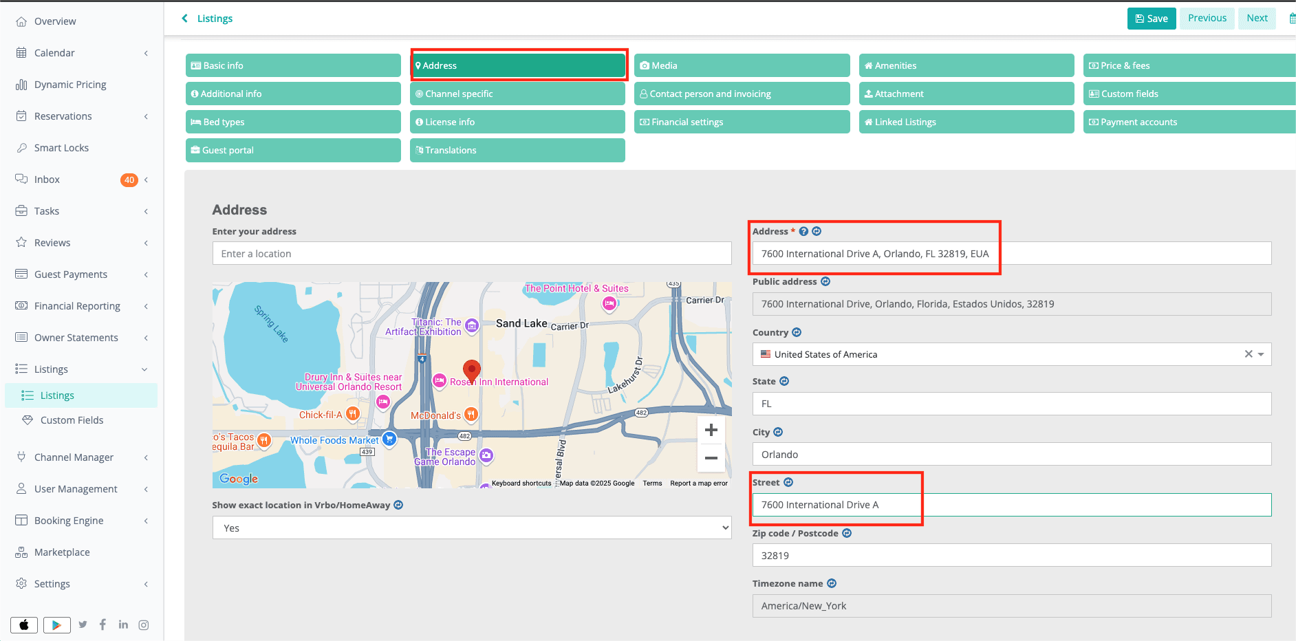 Direct Integration :When adding/editing a listing on your Hostaway account, select the Address section and then update the Street field with the address.