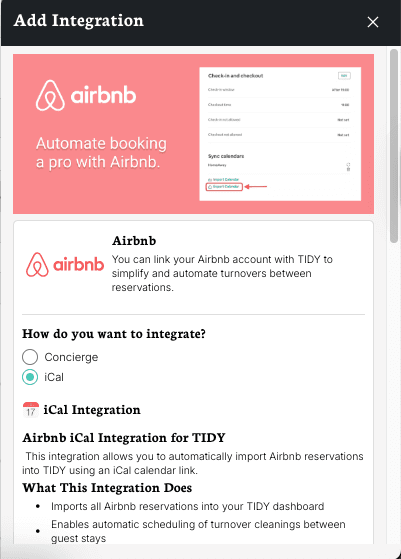 Most integrations work via an iCal link, this includes our most popular integrations with Airbnb, VRBO, and Booking.com. An iCal link looks similar to a website link, but it's used to watch for events in a calendar.