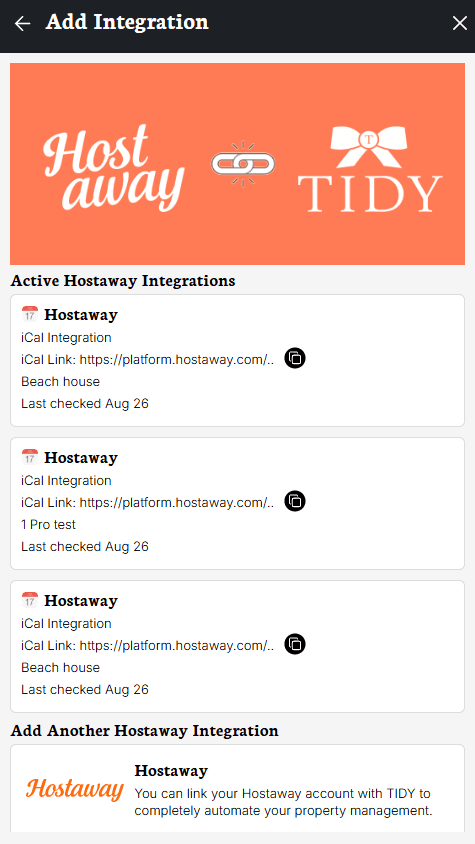 If you have an active integration with any of the options in TIDY, whenever you try to add a new one, you will be able to see all of the active integrations for that specific website.