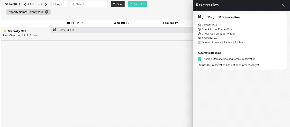 5\. Set up Automatic Booking. See Automatic Booking for more details. Automatic Booking works after events, so for rental guests it is the "check out" day. The "Book No Earlier Than" time is the earliest someone could arrive to do the job on the check out day. Most clients pick a time about 30 minutes after their regularly scheduled check out time. The "Book No Later Than" time is the latest time someone could complete the job on the check-in day. Most clients pick a time 30 minutes before the regularly scheduled check in time.