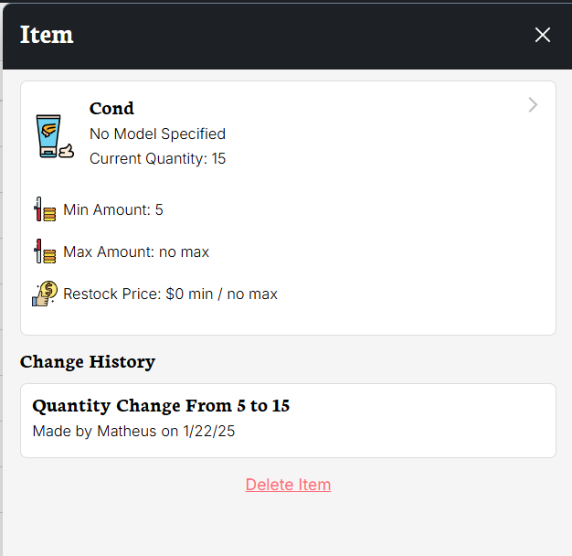 Once an item is added and has been changed, you can also keep track of all changes made, by clicking on the icon, on the Restocking page: