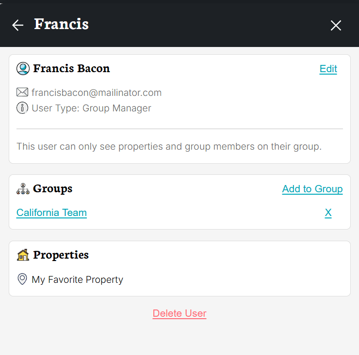 - Group Managers can see and do anything on properties in their group. To add a group manager, you must first create a group. For more information, see Groups