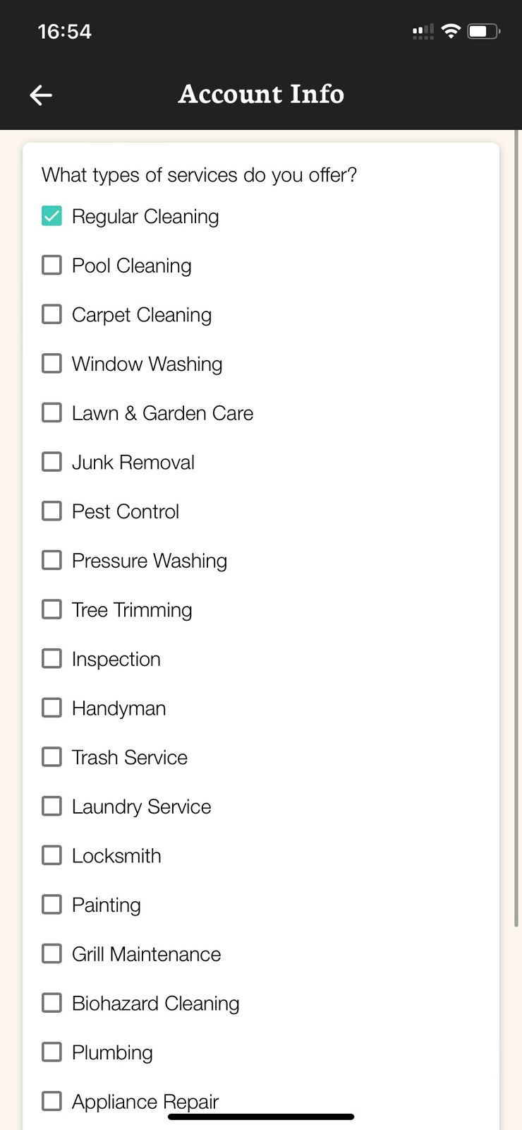 - Go to your dashboard follow any account setup steps outlined for you. Depending on your goals and the features you want to use, you will see different options. For example, you may see the types of services you may want to select (e.g., Regular Cleaning, Window Washing).