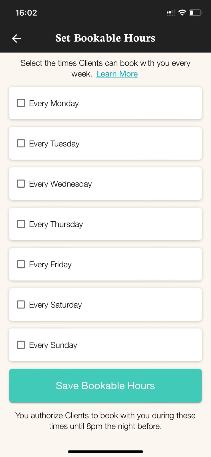 - Make yourself Bookable by setting your available hours that clients can book you on your website.