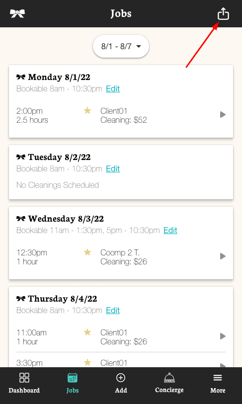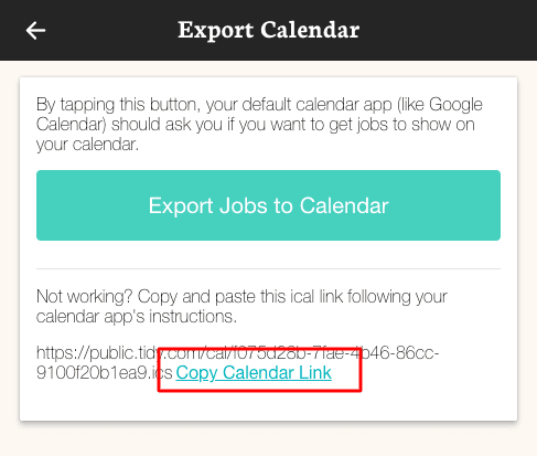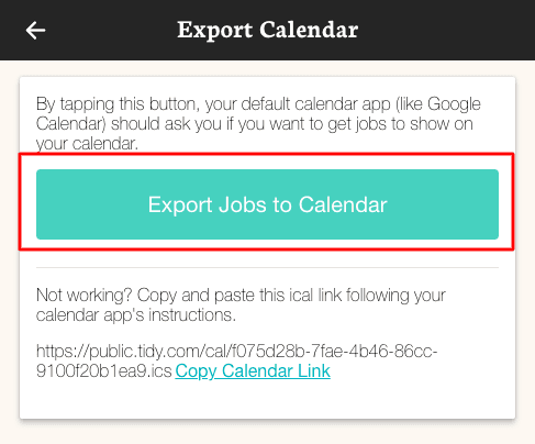 To export your TIDY Calendar, navigate to the "Jobs" section of your account, then click/tap the export option located at the top right.