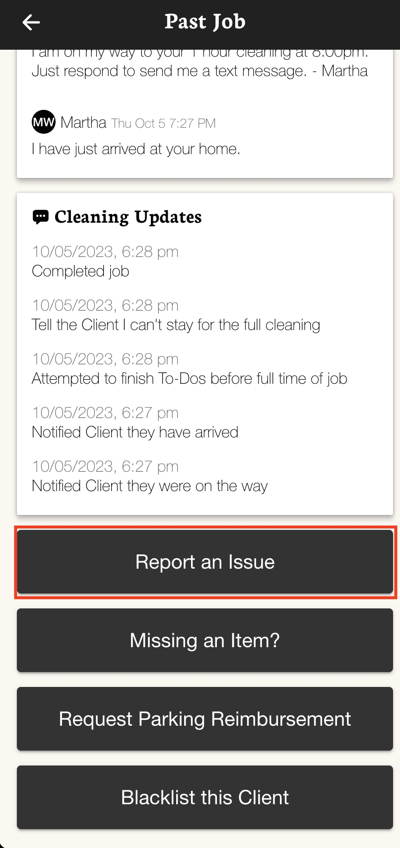 To log an issue for a TIDY Client, complete the job, then navigate to this job page, in your "Jobs" menu. You should see the "Report an Issue" button, right below the cleaning updates section.