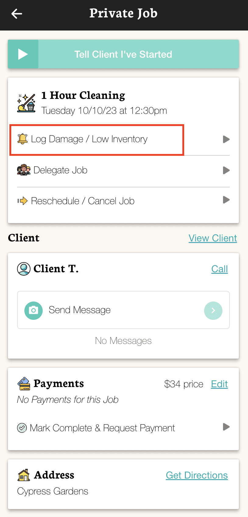 On some jobs, you have the ability to log an issue directly on the job page. Tap "Log Damage / Low Inventory", then select one of the issue category.