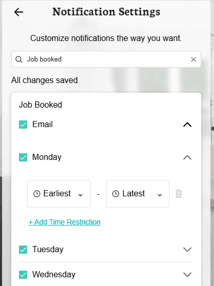 You can limit what days and times each type of notification is sent to you - you can set up Booked Jobs notifications to be sent every day only after 8:00 am, for example.