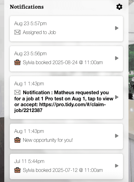 You can get multiple notifications from your TIDY app, such as Jobs Booked, Tomorrow's cleaning reminder, Job delegation Request, Job cancelled, or Payment-related ones, for example.